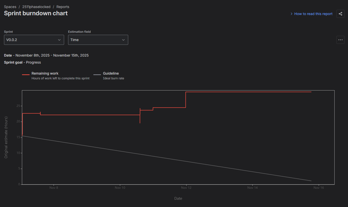 The sprint burndown chart is currently flat, showing that the team has not yet logged work against their tasks. This is common at the very beginning of a sprint as the team is likely finalizing designs and beginning implementation. My focus is to ensure this line starts trending downward consistently
