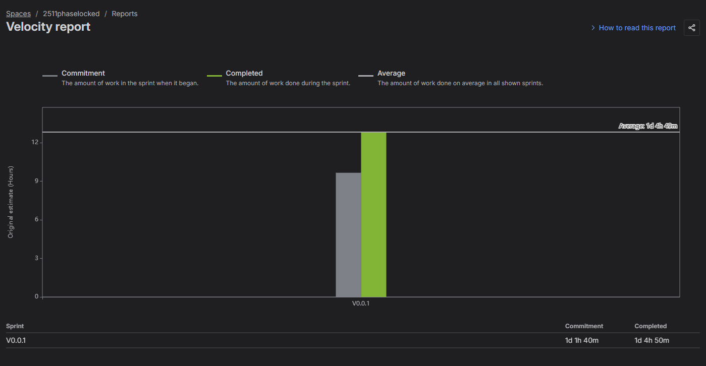 The velocity chart shows a single data point from their previous sprint (v0.0.1). With only one sprint of historical data, the team's velocity is still being established. This underscores the importance of the current sprint for setting a realistic baseline for this small team's capacity.