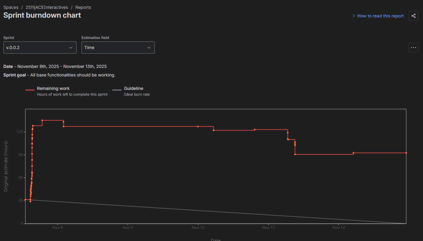 The team started their sprint with a clear goal: "All base functionalities should be working." The burndown shows a perfect pace initially, tracking the ideal guideline. However, progress has stalled midway through the sprint, indicating they may have encountered a complex impediment or underestimated some tasks. This is a key metric for me to discuss with them to unblock progress.