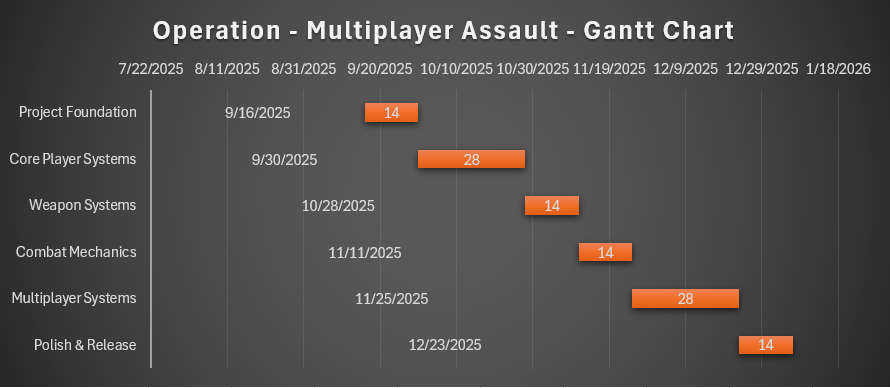 - Pre-Production (2 weeks): Technical design, multiplayer architecture